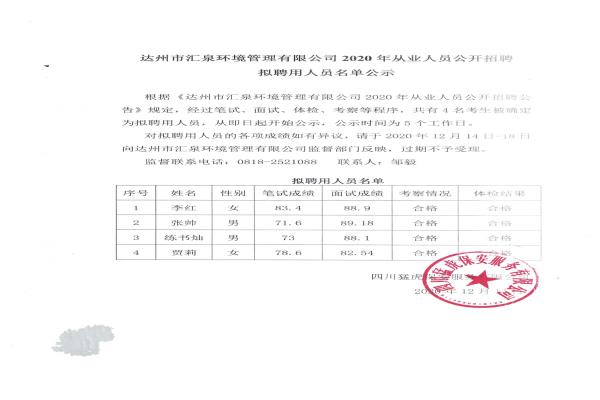 標(biāo)題:達(dá)州市匯泉管理有限公司2020從業(yè)人員公開(kāi)招聘擬聘用人員名單